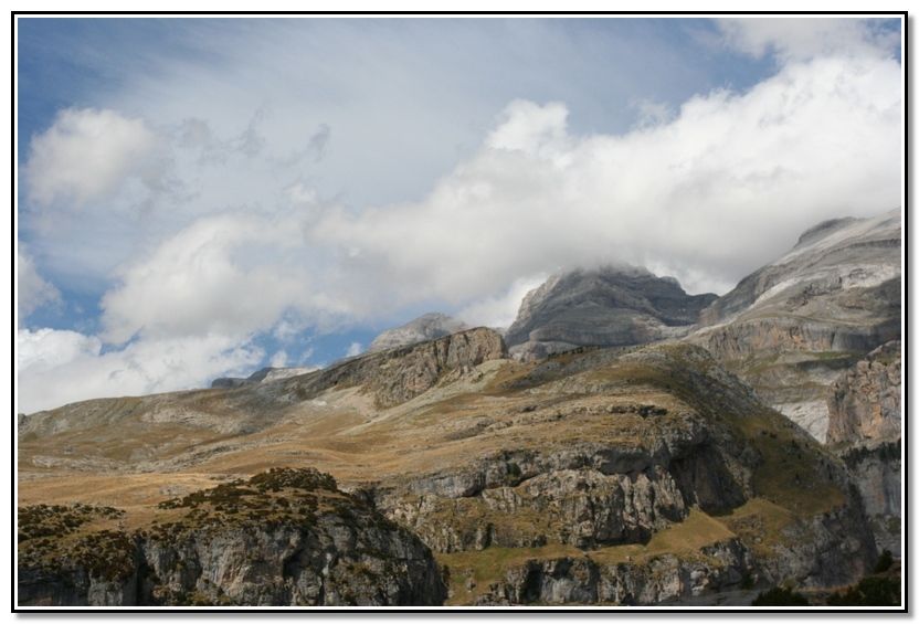 La Custodia, Torre de Goriz. Entre nubes el Perdido y Soum de Ramond. Las Olas, collado de Añisclo y La Suca.