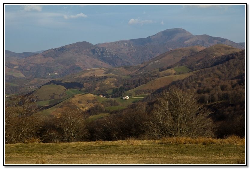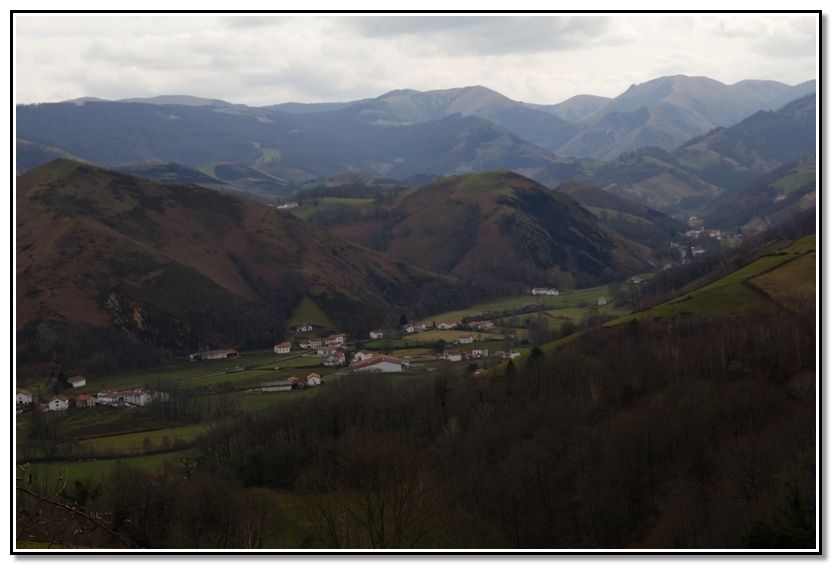 Casas y valle de Aldudes, al fondo casas de Urepele. Al fondo, Astobizbar, Lindus, Urtarai y Sorotepo.