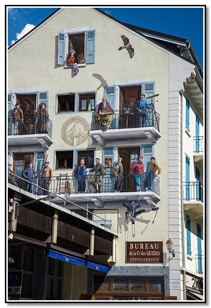 Historia del alpinismo pintado en una fachada.