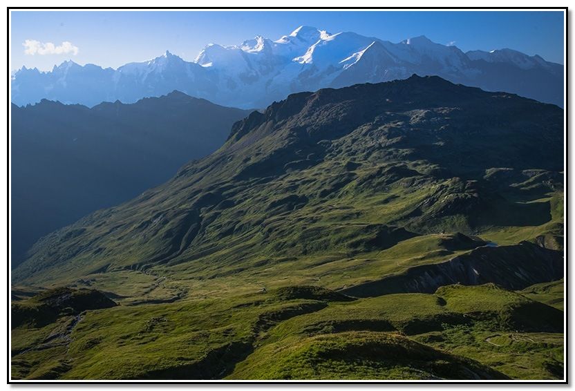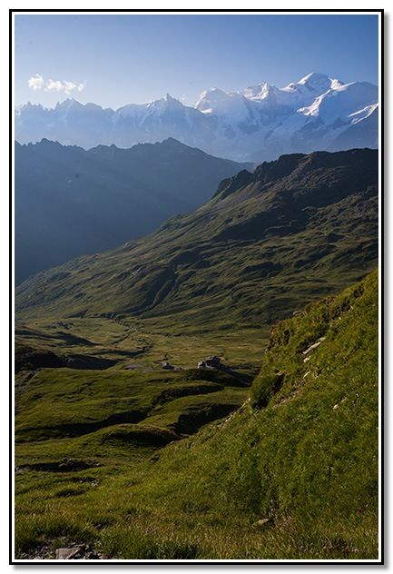 Chalets de Moëde, refugio de Moëde Anterne. Pointe Noire de Pormenaz. Detrás Agujas Rojas, al fondo Agujas de Chamonix, Aiguille du Midi, Mont Blanc du Tacul, Mont Maudit, Mont Blanc, Dôme de Goûter.
