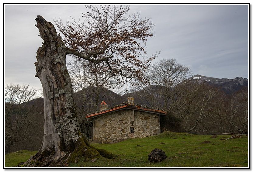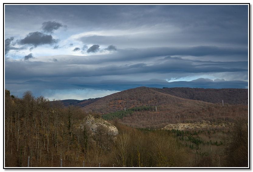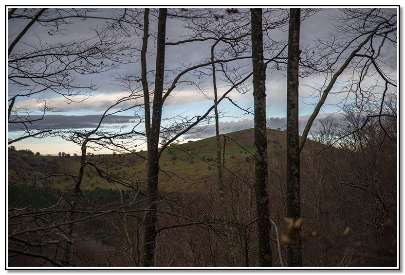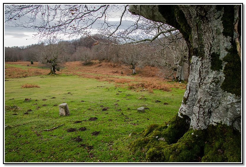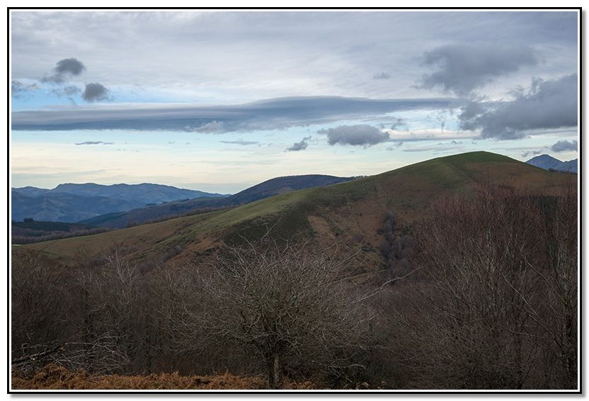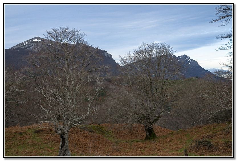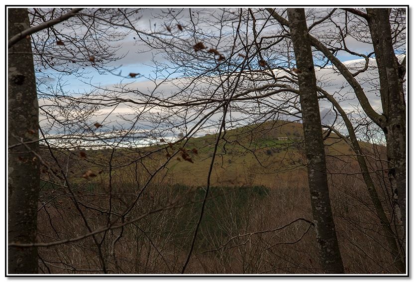 Entre los arboles se distingue el collado de Iramendi, esta zona es un saroi con su artamugarri correspondiente. En verano con las hojas no se distingue.