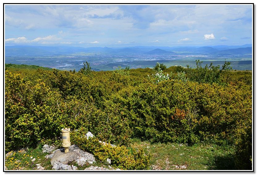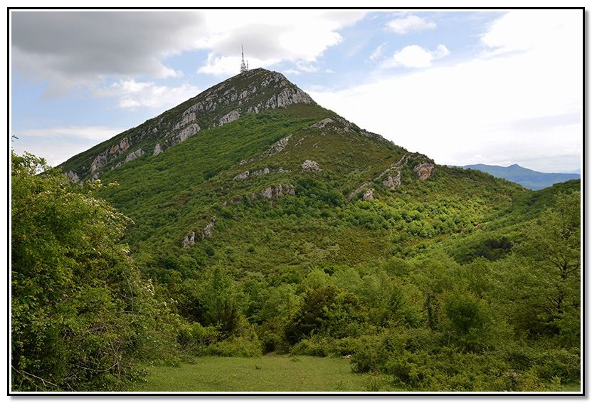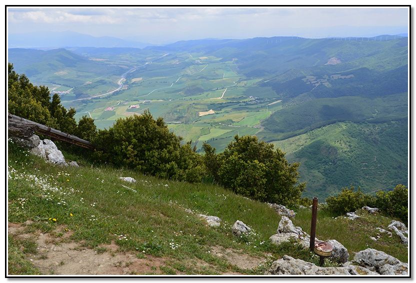 Llegamos a la cima de Elomendi. Vemos el Txanburu y la sierra de Alaiz.