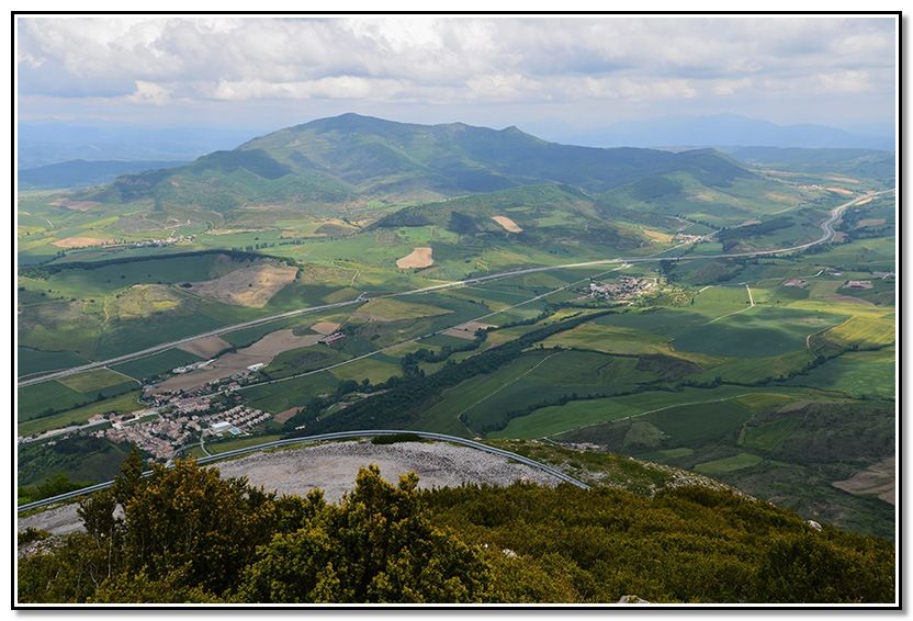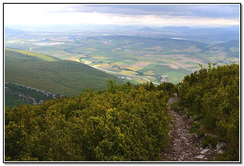 Y sus vistas. Iruña. Al fondo Satrustregi, Txurregi, Gaztelu. Aralar, Ezkaba.