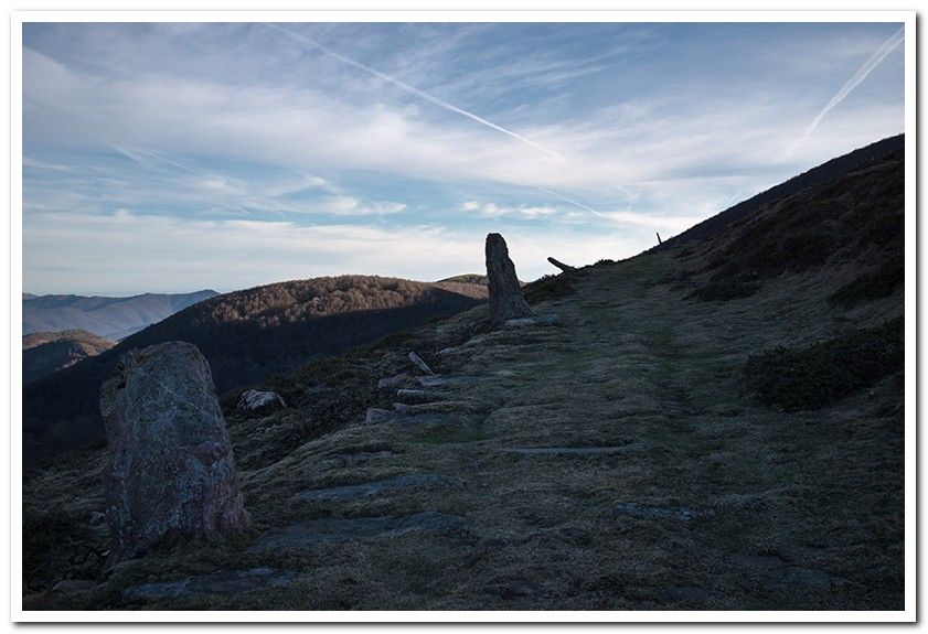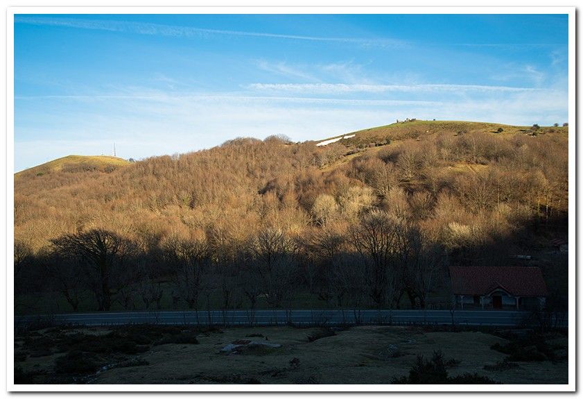 Al principio me dirijí hacia la "Calzada de los Menhires" para bajar al convento de Belate y por Urdanbidegi, volver a pasar la carretera y ya dirigirme hacia Giltzurriñarri, donde hay restos de un dolmen, Matrakola, Etxolaberriko Harria, Larrepil, Putzuetakogaine, y, rodeando el Golbaiko Gaina, pasar por Berriozokoa con sus feas antenas y hacer visita al viejo castillo de Gazteluzarra para volver al lugar de inicio.
