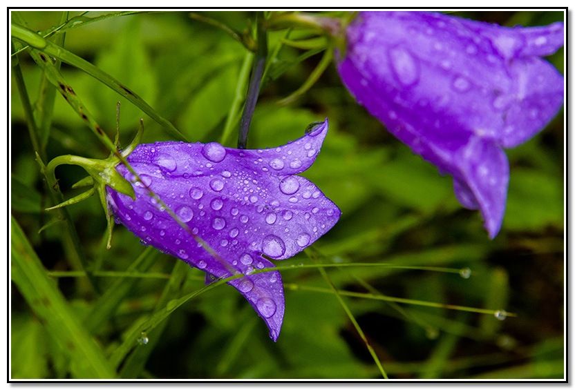 Gotas de agua, a la noche había llovido, en una Campanilla de Scheucher