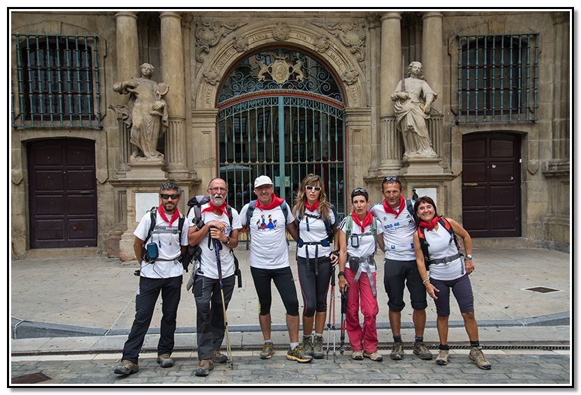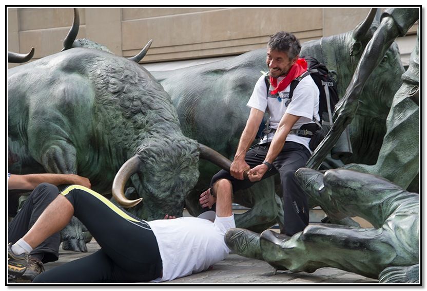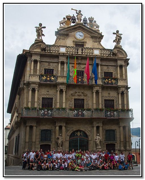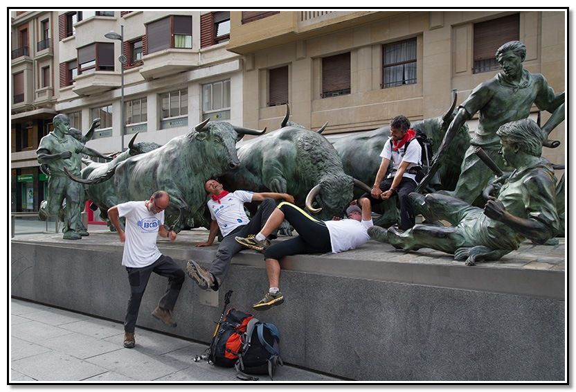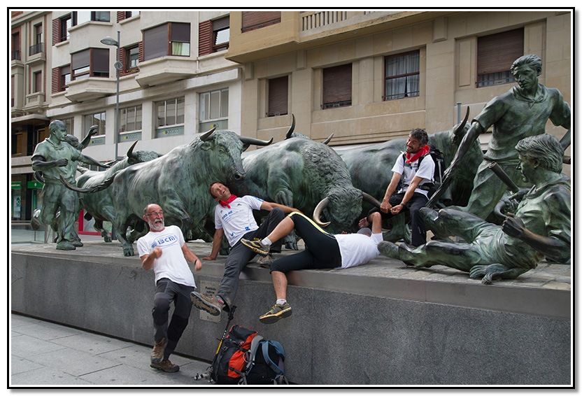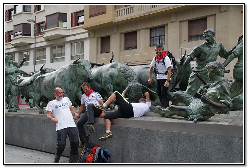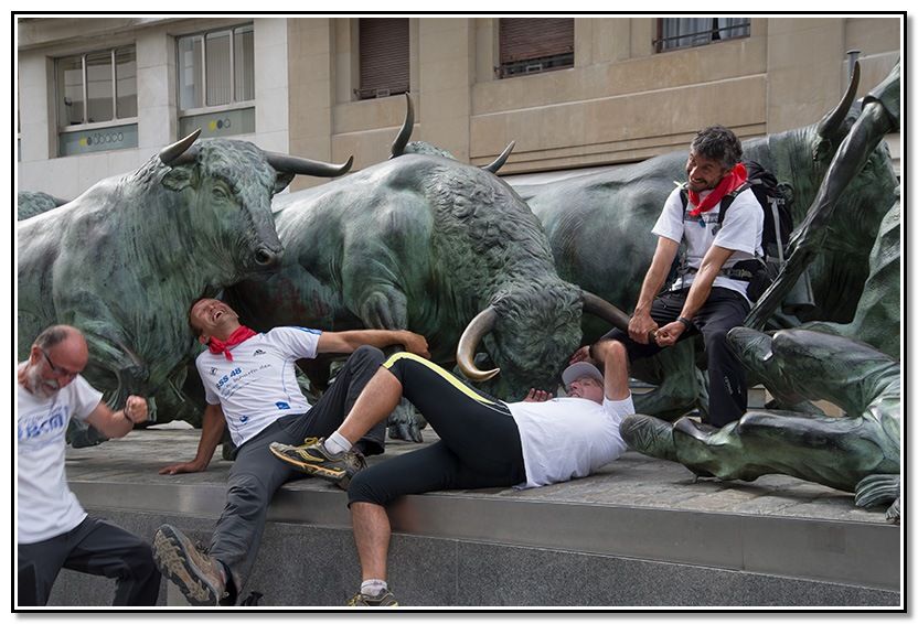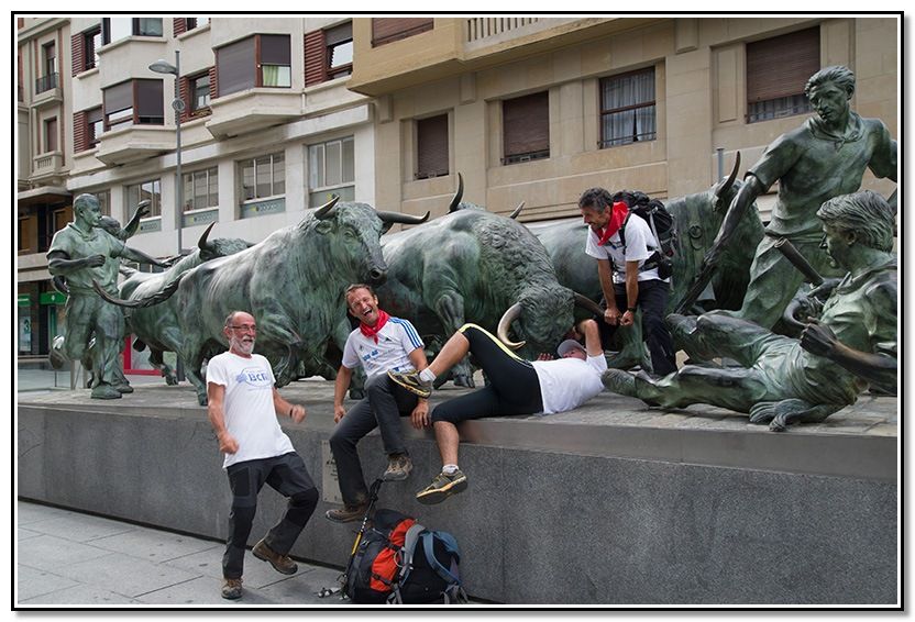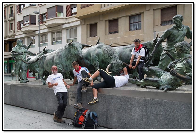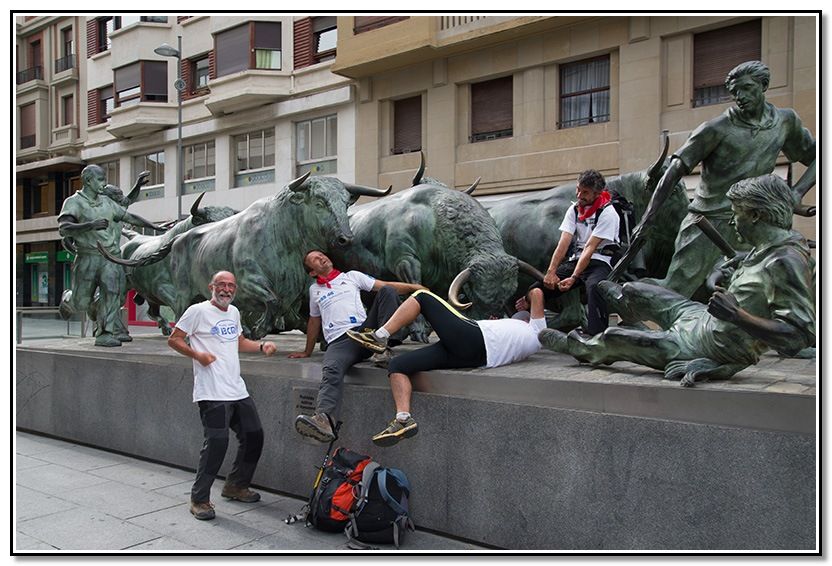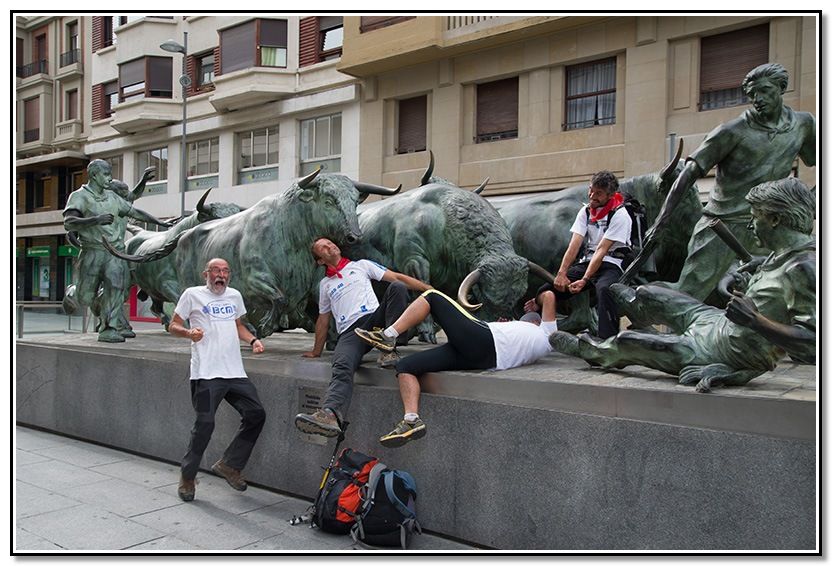 Buenos tragos de agua en Ardanaz y Badostain y calor hasta que llegamos a la Plaza del Ayuntamiento de Iruña donde hicimos una foto de toda la gente que estábamos y también alguna tontería en el monumento al encierro, precioso y espectácular, tiene mucha fuerza.