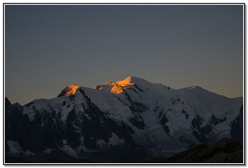 El sol ya daba en las cimas del Mont Blanc Du Tacul, Mont Maudit, Mont Blanc y Dôme de Goûter