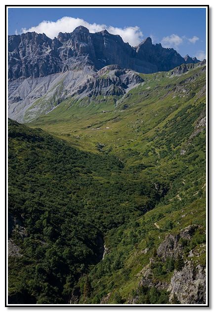 Había que bajar por ese sendero hacia Pont d´Arlevé, abajo, en el valle. También se ve el Pointe Noire de Pormenaz, Refugio de Moëde Anterne, Aiguille y collado de Anterne, Tete de Moëde. Los Fiz.