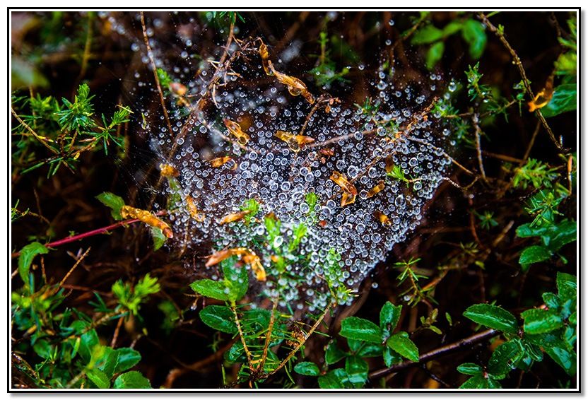 Hay montón de telas de araña llenas de gotitas, pero sin araña.