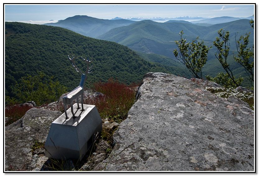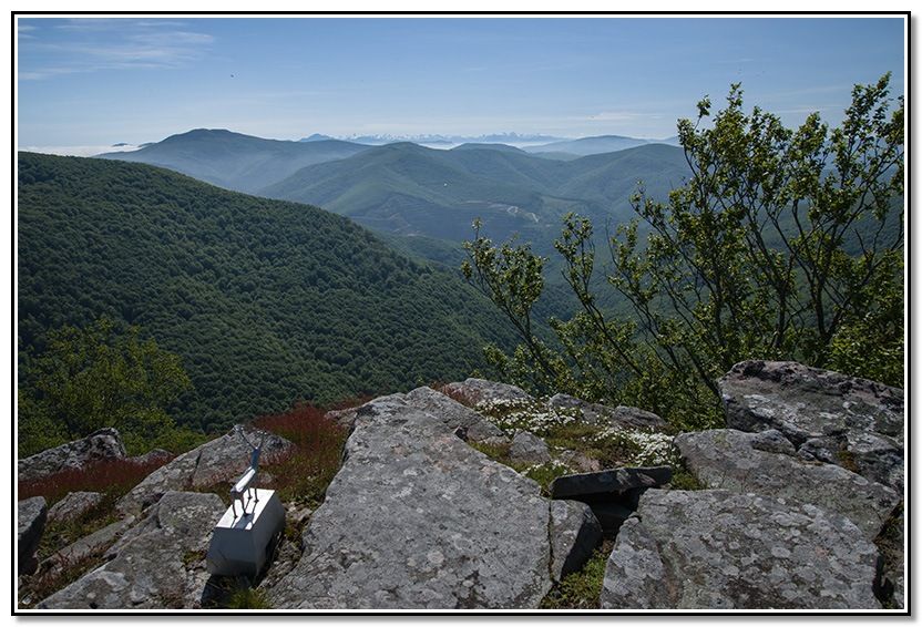 Subimos a Zuriain, almorzar algo y ver el paisaje, a lo lejos veíamos nuestro Piri, todavía con algo de nieve, siguiendo el horizonte, distinguíamos, Peña Izaga, Iruña, Erga, delante de Irurtzun, Aralar, al fondo Beriain ... seguíamos hacia el norte, otro montón de conocidas cimas.