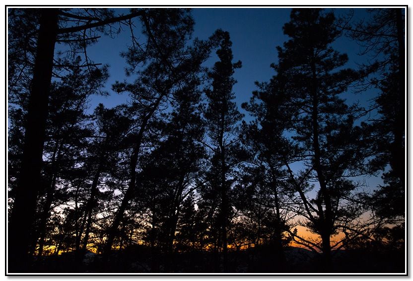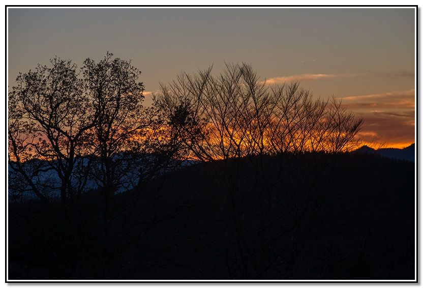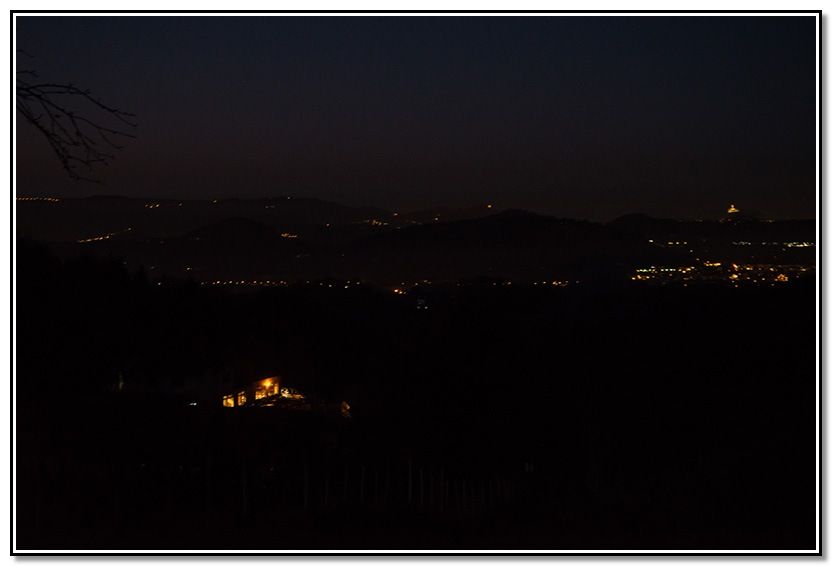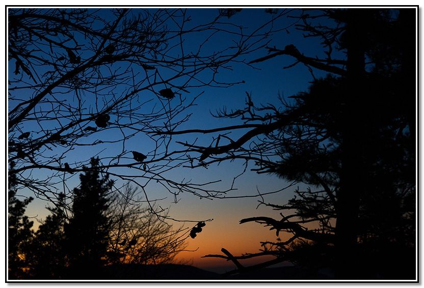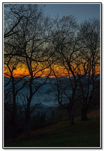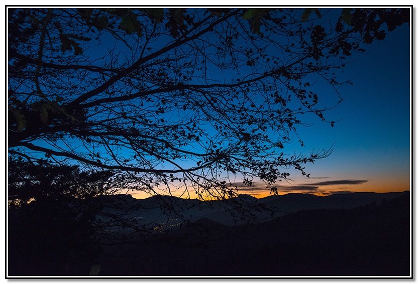 En el collado y entre los árboles, noto los últimos colores y las luces de los pueblos se empiezan a ver.